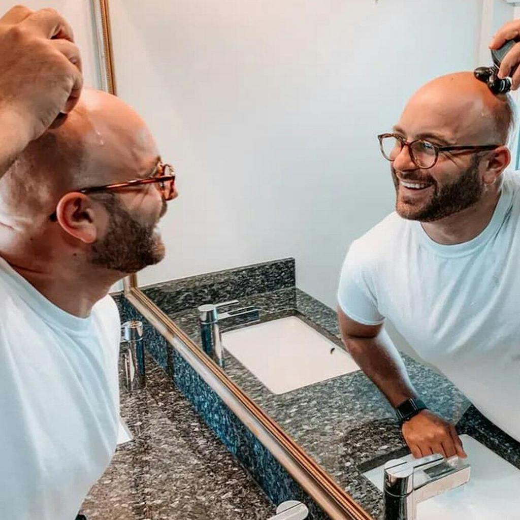Après : un crâne lisse, net et uniforme , une peau visiblement plus saine, sans rougeurs ni marques — un résultat propre et professionnel dès la première utilisation.